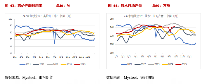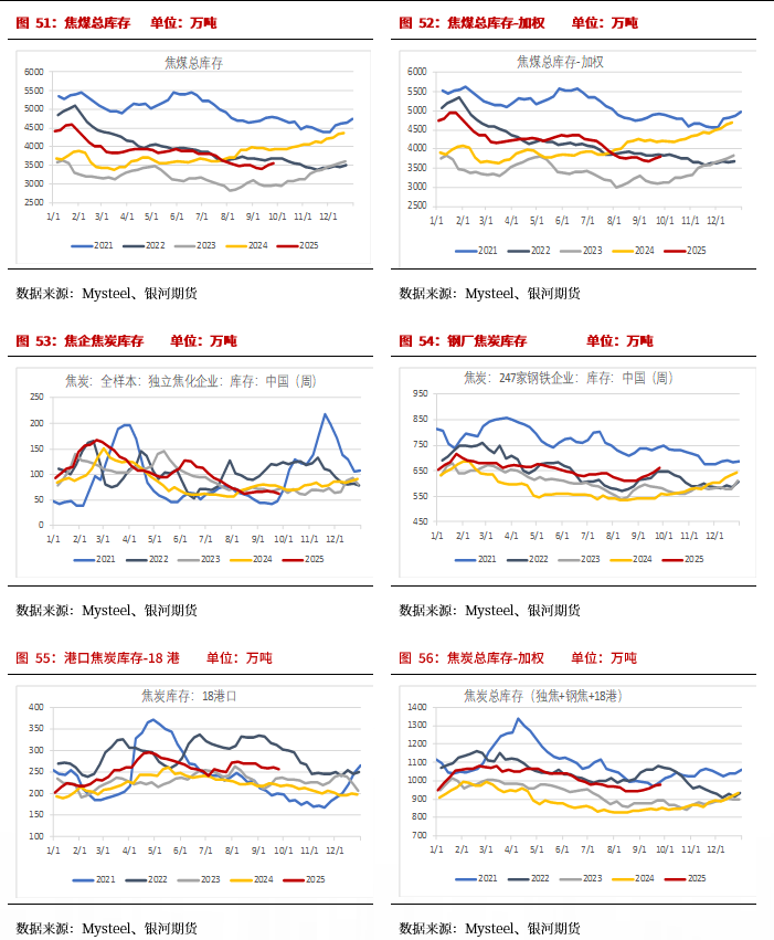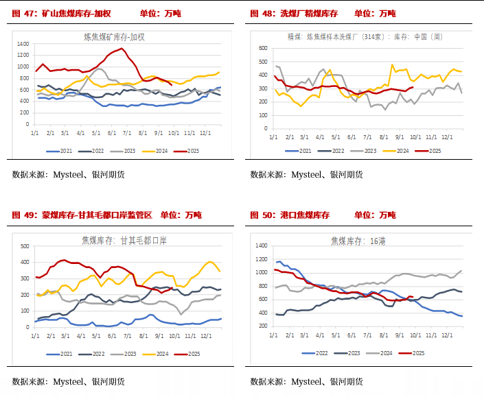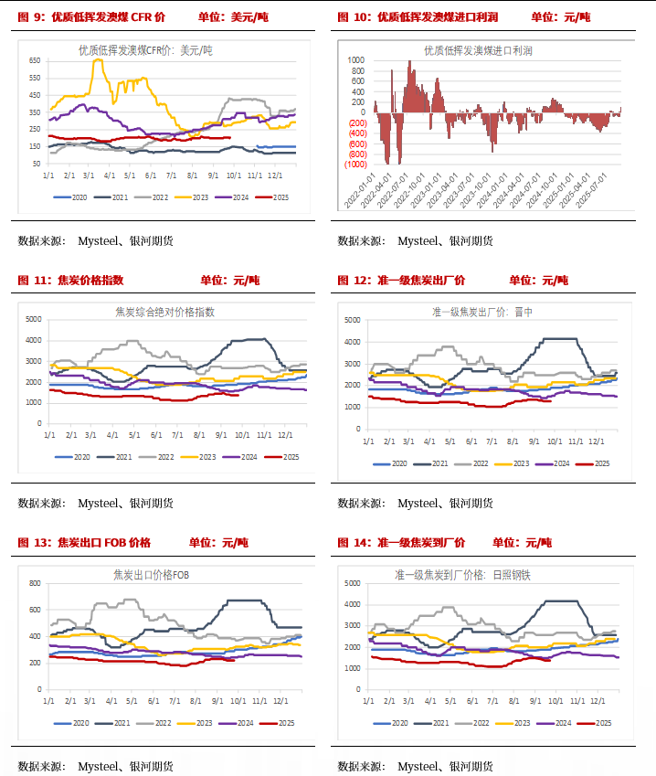 预计10月国内焦煤供给比较平稳,低于去年同期,进口煤有增长空间;需求端预计10月铁水产量依然处于高位,对于原料价格也有支撑,当前市场供需较为平衡,无明显矛盾。中期看,未来宏观经济防通缩依然是重点,也就意味着反内卷会时不时重提,具体到煤炭,未来煤矿查超产等还存在反复的情况,这对焦煤价格形成较大的支撑。国内焦煤产量在反内卷、查超产等影响下会受到压制,不确定在于对未来煤炭产量调控力度,预计焦煤产量难以回到上半年高点,也会低于去年同期水平,不过进口煤有一定补充,总体而言我们认为供给端是有政策托底的。对于上行高度,重点在于需求,目前看钢材需求有韧性,但看不到明显的亮点,钢材的需求及利润情况制约了原料的上涨空间。