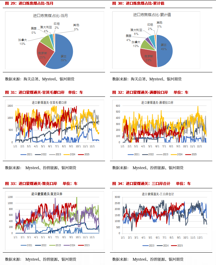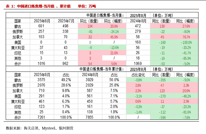 海关总署数据显示,2025年8月中国进口炼焦煤1016万吨,环比增加54万吨,进口蒙古国、俄罗斯、加拿大、美国、澳大利亚占比分别为59.2%,25.3%,10.1%,0%,3.7%,进口蒙煤与俄煤合计占比达84.5%。具体看,其中进口蒙煤601万吨,环比上升20.8%,增幅明显,在反内卷和查超产的影响下,国内煤炭产量受到影响,价格回升,市场对于中期煤炭市场信心改观,蒙煤进口利润也回升,进口蒙煤通关处于高位。进口俄罗斯煤257万吨,环比下降24.1%;进口加拿大煤103万吨,环比上升45.9%;进口澳大利亚煤37万吨,环比下降13.6%。