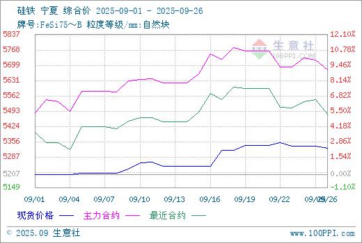 9月利好消息不断,盘面价格明显上冲,业内信心得到明显提振,再加之成本端支撑较为稳固及钢招之际叠加行业传统需求旺季整体需求存释放预期,硅铁在9月份整体表现向好。据生意社商品行情分析系统,9月26日硅铁(牌号:FeSi75~B;粒度等级/mm:自然块)宁夏地区市场报价在5300-5450元/吨,市场均价5325元/吨,较月初涨2.28%。