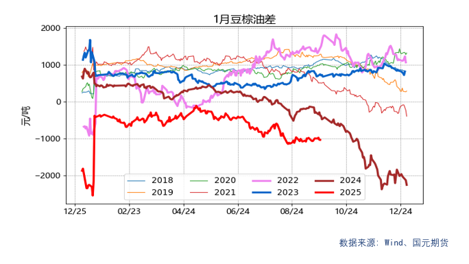 9月25日,1月豆棕油差为-1030.0。