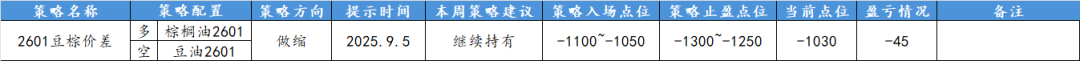 建议2601豆棕价差开仓做缩,策略入场点位-1100~-1050,策略止盈点位-1300~-1250。