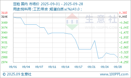 据生意社商品行情分析系统显示,9月豆粕行情弱势下行,振荡下跌为主。9月1日,豆粕市场均价3106元/吨,9月28日,豆粕市场均价2988元/吨,下跌3.8%。