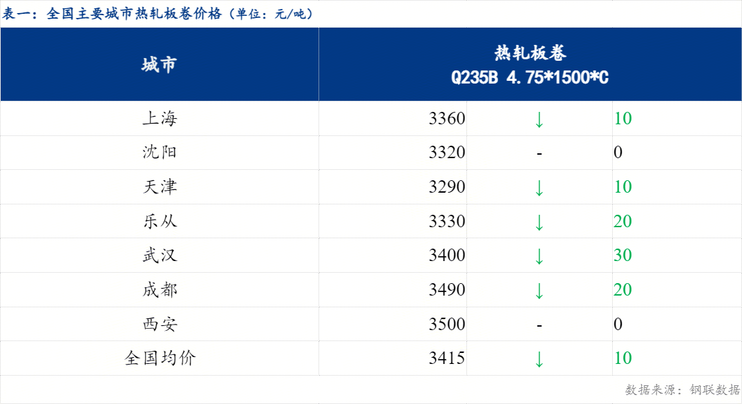今日热轧板卷全国主要城市价格小幅下跌,截止发稿时3.0mm热轧板卷全国均价3470元/吨,较上个交易下跌11元/吨。4.75mm热轧板卷全国均价3415元/吨,较上个交易日下跌13元/吨。今日黑色商品期货休市,周五夜盘热卷01合约震荡下行,今日现货价格小幅下跌,整体交投氛围偏弱。