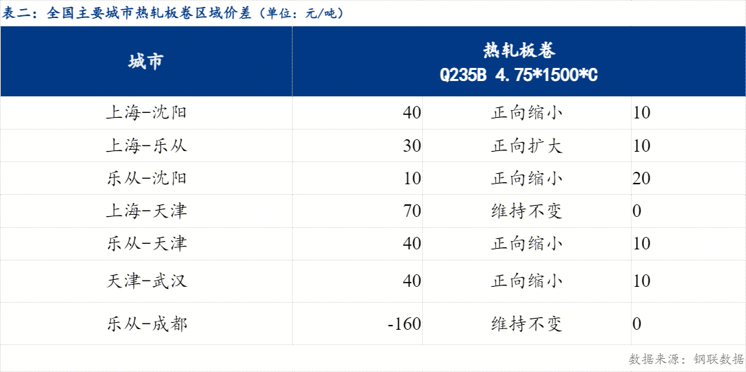 从区域价差来看,华东与东北价差40元/吨,较上一交易日正向缩小10元/吨 ;华东与华南价差30元/吨,较上一交易日正向扩大10 元/吨 ;华南与华北价差为40元/吨,较上一交易日正向缩小10元/吨 。