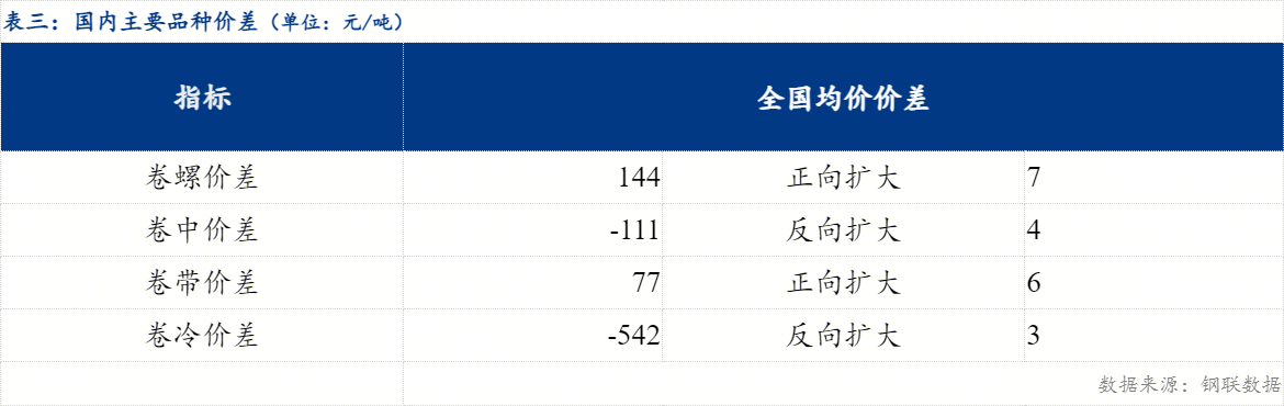 从品种价差来看,卷螺差较上一交易日正向扩大7元/吨 ,热中价差较上一交易日反向扩大4元/吨 ,热带价差较上一交易日正向扩大6元/吨 ,热冷价差较上一交易日反向扩大3元/吨 。