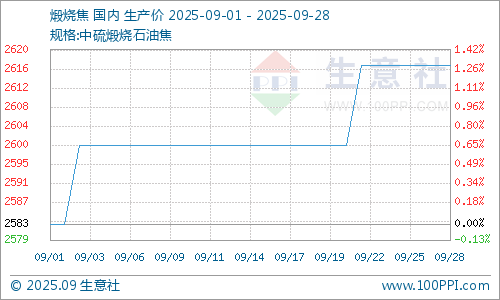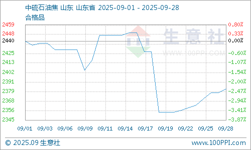 据生意社商品分析系统显示,本周地炼石油焦行情小幅上涨,截止到9月28日山东市场地炼石油焦价格为2383.25元/吨,较9月22日2357.50元/吨上涨1.09%。