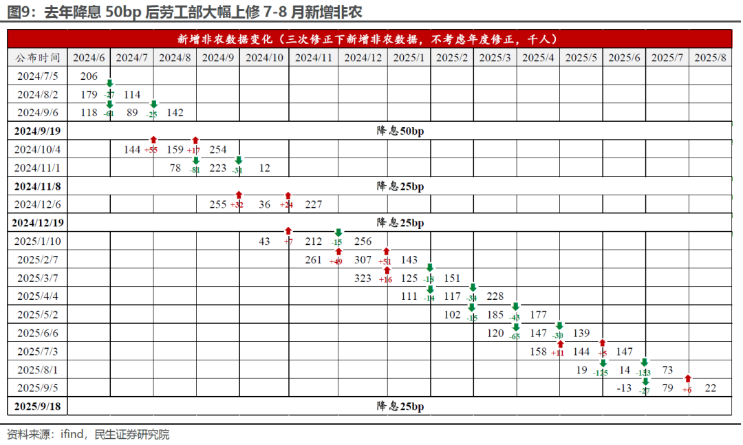 因此,8月非农对降息预期的指引可能存在扰动,类似情形也曾在去年美联储首次降息前后上演:去年6-7月非农数据接连下修、失业率上行曾引发市场衰退恐慌,推动美联储9月降息,市场一度定价11月再降50BP。但10月劳工部大幅上修7-8月非农数据,导致衰退叙事与50bp的激进预期降温。