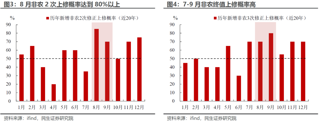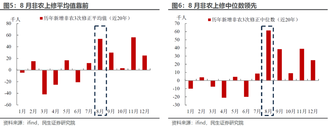 但历史经验显示,9月公布的8月新增非农初值往往会在10月季节性上修。我们参考过去20年的数据来看(2005-2024年),8月非农在10月的2次修正中上修的概率达到80%以上,为历月最高,而11月公布的终值最终上修的概率也达到70%左右。