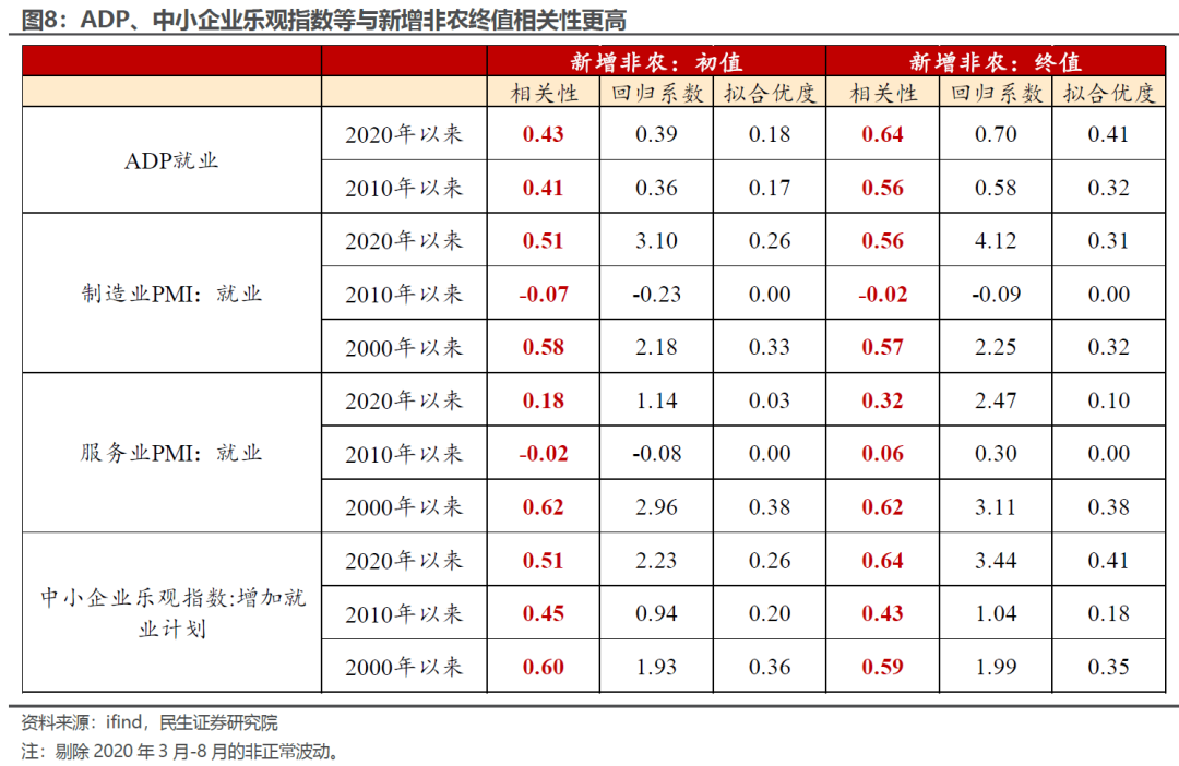 横向对比其他劳动力市场指标,8月非农也存在低估概率。ADP就业、PMI就业指数、中小企业招聘计划等指标与非农终值的相关性普遍高于非农初值,而当前这些指标8月的下行幅度均可控,并未像非农初值剧烈放缓。这一对比也暗示,8月非农在后续有一定的上修概率。
