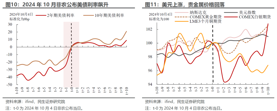 资产反映上,美债利率尤其是短端(2年期)当日飙升约20bp;美元上涨,金银铜等贵金属价格短期明显回调;美股短期小幅回落,但最终在衰退叙事的退坡和温和的降息助推下继续上涨。当然与上次不同的是,本轮资产定价更多来自于降息预期的押注,没有衰退叙事的参与,这也意味着非农上修对风险资产的负面影响可能更大。