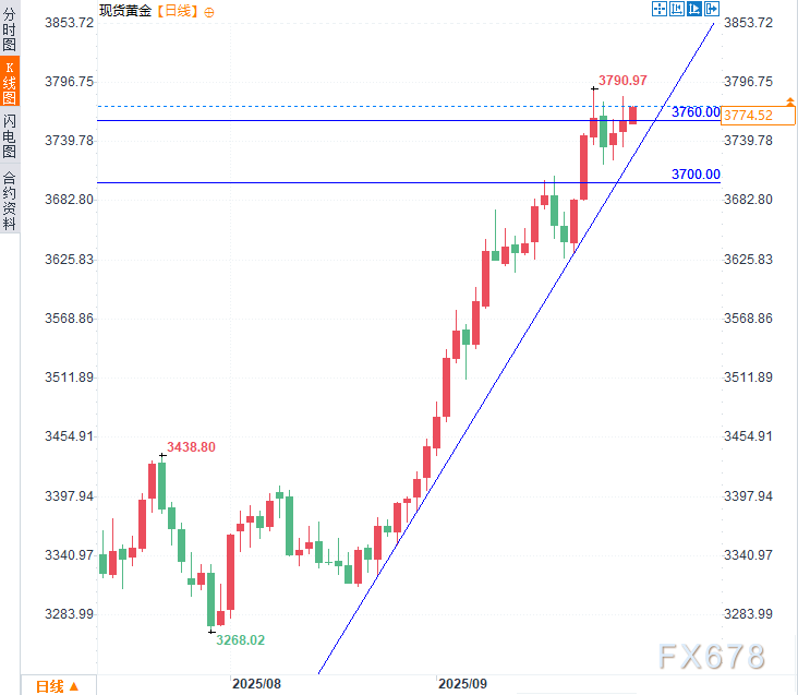 汇通财经APP讯——周一(9月29日)亚市时段,现货黄金延续前一交易日涨势,最高触及3788.66美元/盎司,目前交投于3780美元/盎司附近,涨幅约0.5%。上周黄金的下跌再次迎来买入,尽管美元在整体向好的美国数据支撑下获得些许青睐,金价仍在周中实现反弹。上周五,这种贵金属收于3760美元关口附近,逐步逼近3800美元整数心理关口。