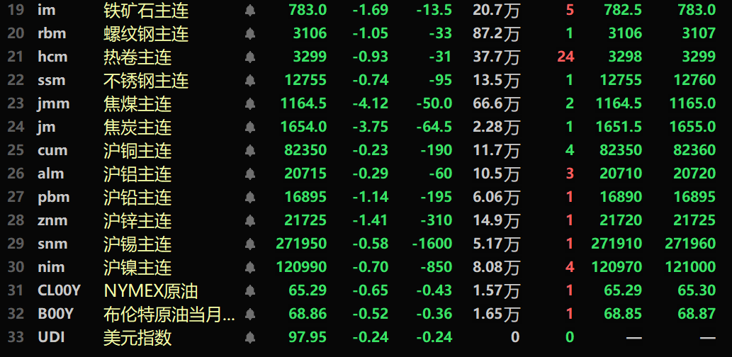黑色系均飘绿,铁矿跌1.69%,螺纹跌1.05%,热卷跌0.93%,不锈钢跌0.74%。双焦方面:焦煤主力合约跌4.12%,焦炭主力合约跌3.75%。