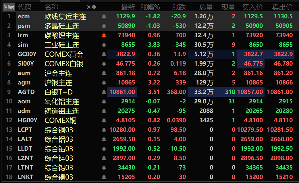 此外,铸造铝主连期货跌0.47%,氧化铝主连跌0.07%。碳酸锂主连涨0.96%,工业硅主连跌3.83%。多晶硅主连跌1.03%。