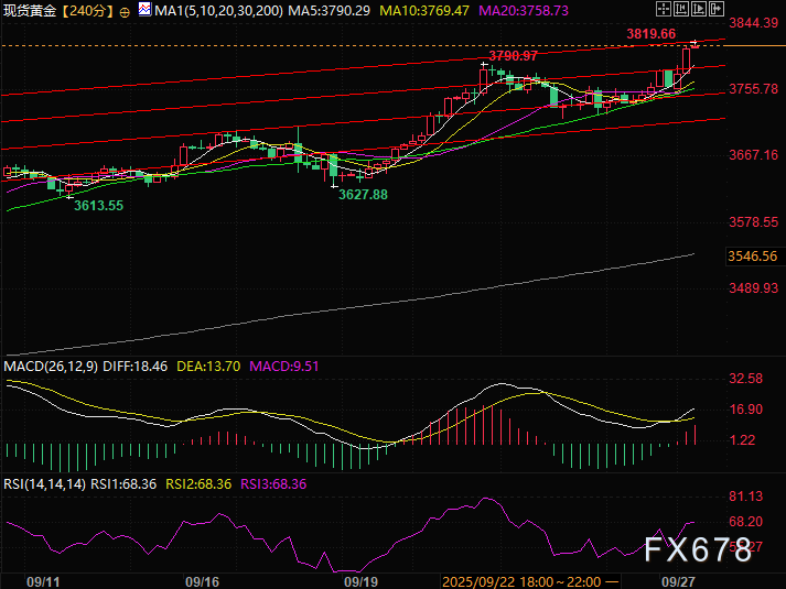 汇通财经APP讯——周一(9月29日)亚欧时段,黄金价格延续强势上行态势,突破3800美元心理关口并创下历史新高,目前涨1.48%,交投于3816.50附近。