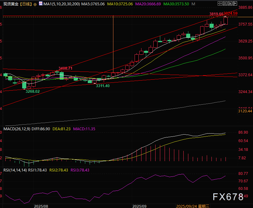从日线图来看,黄金价格持续维持在5日指数移动平均线(EMA)上方但是离5日线距离较远,有拉回的需求,同时现货黄金三角形大形态的突破量度涨幅价在3824.50附近,金价基本快要达到。