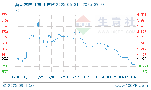 9月份以来,沥青价格受到诸多因素的影响维持震荡下行。据生意社监测数据显示,9月1日山东地区重交沥青#70出厂价格在3680元/吨,截止到29日山东地区出场价格在3593元/吨。