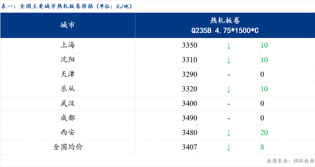 截止发稿时4.75热轧板卷全国均价3407元/吨,较上一交易日下跌8元/吨。其中主要城市价格为上海3350元/吨,沈阳3310元/吨,天津3290元/吨,乐从3320元/吨,武汉3400元/吨,成都3490元/吨,西安3480元/吨。