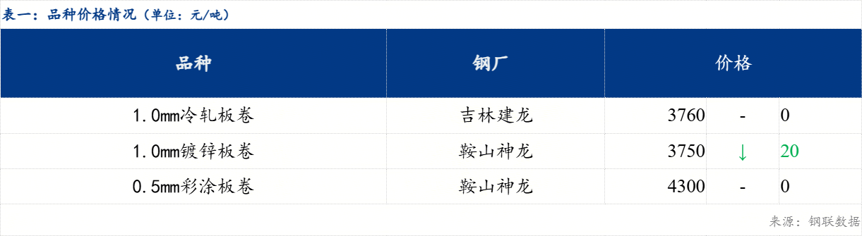 现东北主流市场冷轧镀锌价格持稳运行,沈阳市场冷轧板卷价格3760元/吨,镀锌板卷价格3750元/吨,彩涂板卷价格4300元/吨。具体来看,市场方面,今日热卷期货偏弱运行,市场镀锌现货报价仍小幅下跌, 冷轧、彩涂价格持稳运行,国庆假期临近,市场交投氛围依旧比较清淡,整体成交还是不及预期,贸易商出货以回笼资金为主。 供需双弱格局下,市场需求不及预期,加之钢厂高炉检修,冷系产品受到一定影响,贸易商持谨慎态度为主。综合来看,预计下一交易日东北市场冷轧及镀锌板卷价格或震荡运行为主。