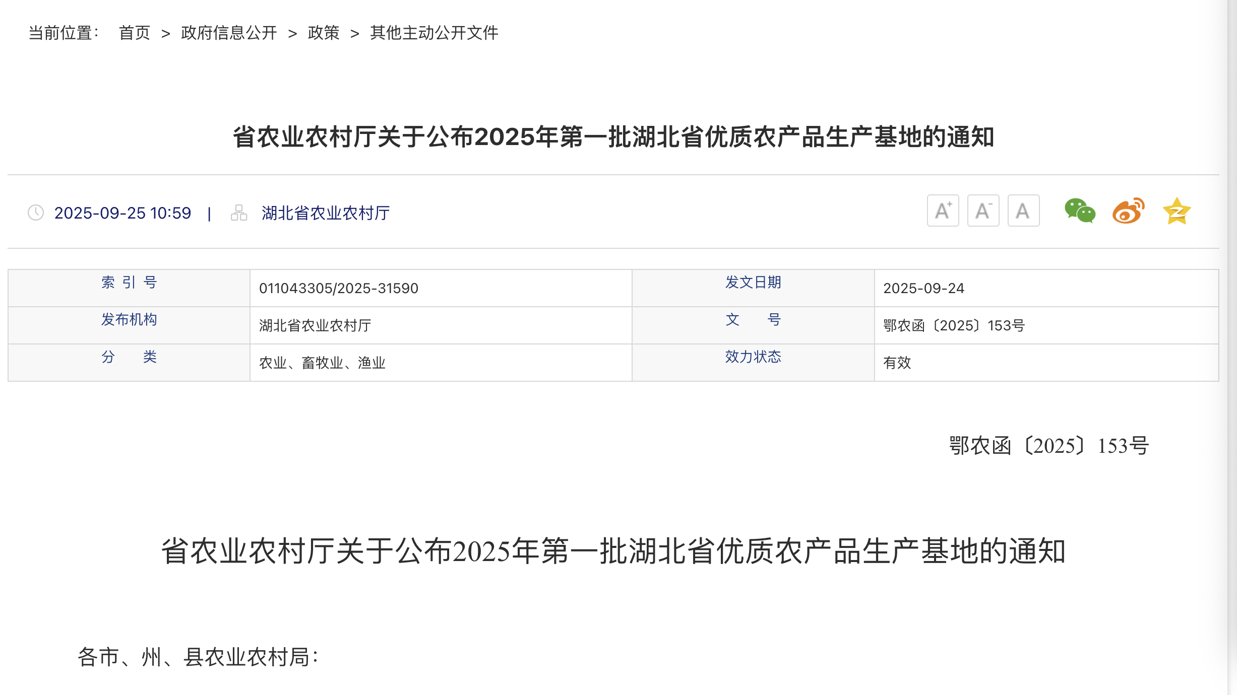 湖北日报讯(通讯员陈清华)近日,省农业农村厅公布了湖北省2025年第一批优质农产品生产基地名单,武汉市13个生产基地成功入选,涵盖全市44个街镇,总面积达110万亩以上。