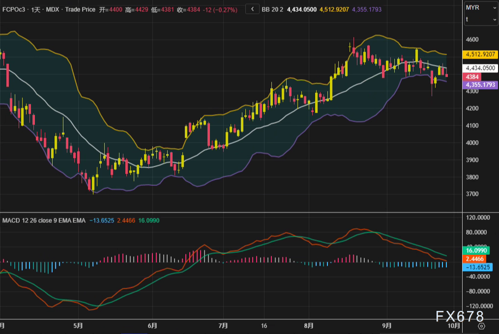 汇通财经APP讯——周一(9月29日),马来西亚衍生品交易所基准12月棕榈油期货合约FCPOc3未能延续反弹,在日内震荡后转而收低,最终报收于每吨4384林吉特,较前一交易日下跌12林吉特,跌幅为0.27%。这已是该合约连续第二个交易日收跌。从技术层面审视,日线图上,布林带轨道位于4355.18至4512.92林吉特区间,价格在中轨4434.05林吉特下方运行。MACD指标显示,下跌动能虽仍存在,但其柱状线有所收窄,暗示下行动力可能正在减弱。