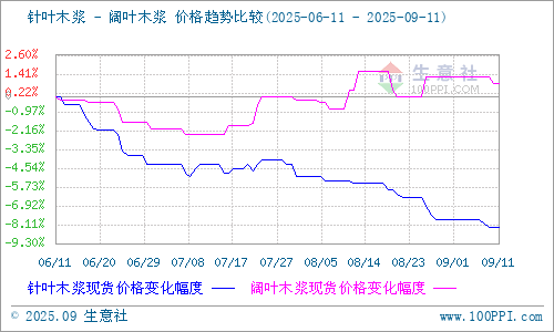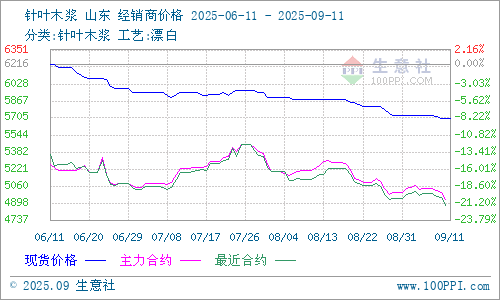 据生意社商品行情分析系统:近期针叶木浆和阔叶木浆价格大稳小动,小幅下调。9月11日,山东地区针叶木浆市场均价为5700元/吨,与9月1日均价相比下降了0.58%;阔叶木浆市场均价为4166.67元/吨,与9月1日均价相比下降了0.4%。