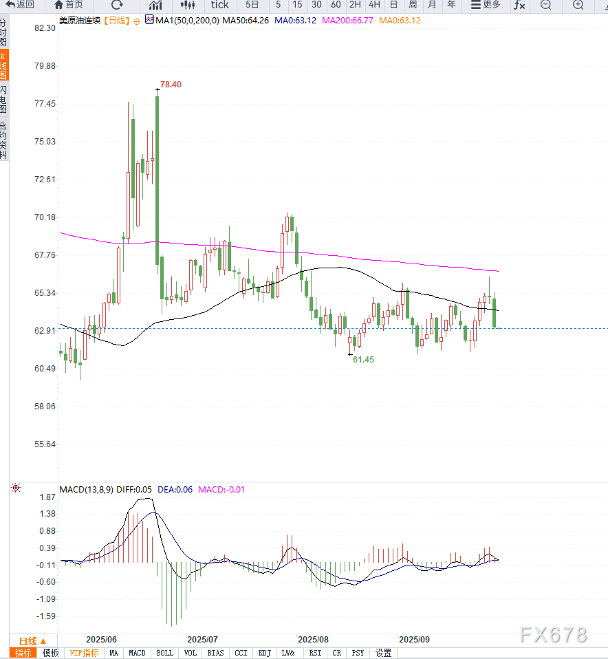 从技术面来看,美原油(WTI)日线图显示,价格已连续两日收阴,并跌破短期均线支撑,MACD指标出现死叉迹象,反映市场动能逐渐减弱。