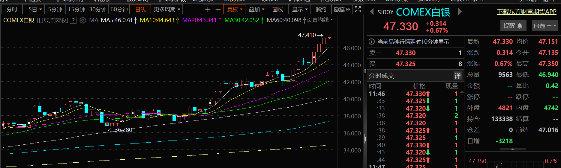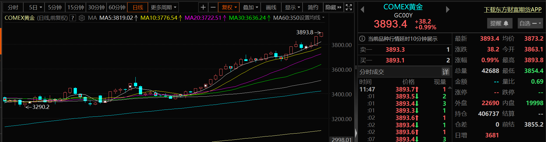 贵金属方面,截至11:57分,COMEX黄金涨0.99%,盘中刷新历史新高至3893.8美元/盎司;COMEX白银涨0.67%。内盘贵金属方面:沪金主连涨1.8%,盘中刷新历史新高至877.16元/克;沪银主连涨1.24%。