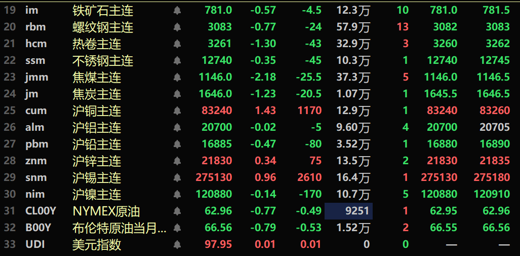 黑色系均飘绿,铁矿跌0.57%,螺纹跌0.77%,热卷跌1.3%,不锈钢跌0.35%。双焦方面:焦煤主力合约跌2.18%,焦炭主力合约跌1.23%。