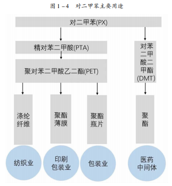 对二甲苯的加工制造产业链为:原油→石脑油→混合二甲苯(MX) →对二甲苯(PX) →精对苯二甲酸(PTA)→聚对苯二甲酸乙二酯(PET) →纺织包装制品等。