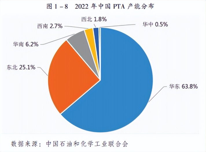 我国对二甲苯几乎全部用于生产PTA,因此PTA产业布局决定了对二甲苯消费区域分布。我国90%以上的PTA工厂分布在沿海、沿江区域,并集中在华东、东北和华南地区。华东地区是我国最重要的纺织加工基地,拥有产能占比63.8%的PTAI厂,是我国最大的对二甲苯消费地。