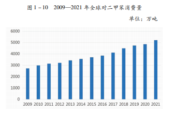 2013年以来,受益于PTA产能及下游聚酯市场的增长,全球对二甲苯消费持续增长。2009- 2021 年期间,全球对二甲苯消费量从2732万吨增至5215万吨,年复合增长率5.5%。