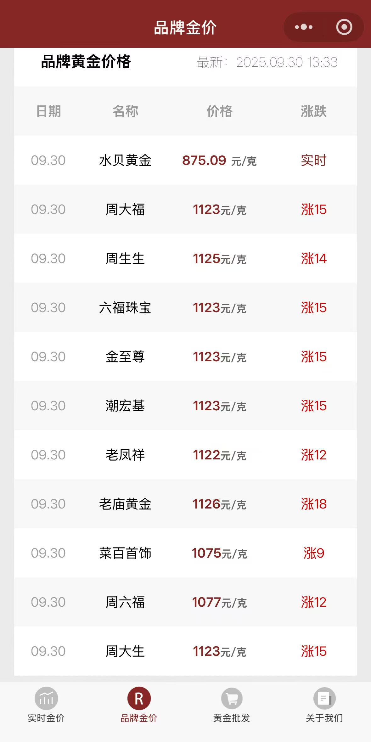 国际金价涨势不止,国内多家黄金珠宝品牌金饰价格也持续攀升。今日金价小程序显示,9月30日,老庙黄金足金饰品报价1126元/克,较昨日上涨18元/克;周生生报价1125元/克,较昨日上涨14元/克;周大福、潮宏基、六福珠宝等多个品牌报1123元/克,较昨日上涨15元/克。