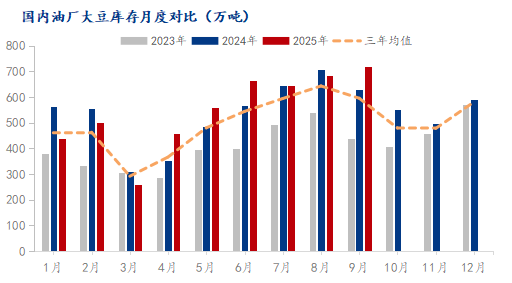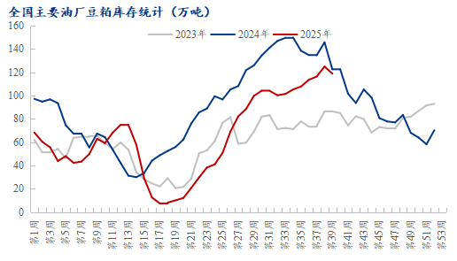 大豆与豆粕库存双双高企。截至9月26日,全国大豆库存达719.91万吨,较上月增加37.38万吨,环比增幅5.61%,同比增幅达14%,较近三年均值高出124.15万吨。这一数据反映出9月到港量仍维持高位,与往年同期开始下滑的态势形成明显对比。豆粕库存118.92万吨,较上月增加13.59万吨,环比增长19.65%,但同比略降2.77%。这一数据特征表明,虽然库存高企压制市场,但在豆粕性价比较高的背景下,下游需求仍保持一定韧性。从库存分布看,华东地区库存压力最为突出,部分油厂库存已接近物理极限;华南地区受台风影响出现大面积停机,库存压力相对缓解。10月份预计大豆到港量949万吨,虽较9月有所下降,但高结转库存意味着供应压力短期内仍将延续。