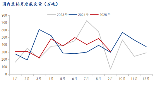9月豆粕市场成交呈现明显分化格局。全月成交总量较8月显著收缩,环比降幅超过三成,反映出市场整体观望情绪浓厚。从成交结构看,呈现明显的"近强远弱"特征,这一现象主要源于市场对四季度供应预期的变化。在供应缺口预期缩小、四季度大豆供应充足的背景下,基差难有大涨空间,导致市场更多倾向于采购现货一口价。提货量方面实现温和增长,环比增幅接近6%,但未出现大规模集中备货现象。这种成交格局体现了市场在供应充裕预期下的谨慎心态,也反映出投资者对远期合约的担忧。