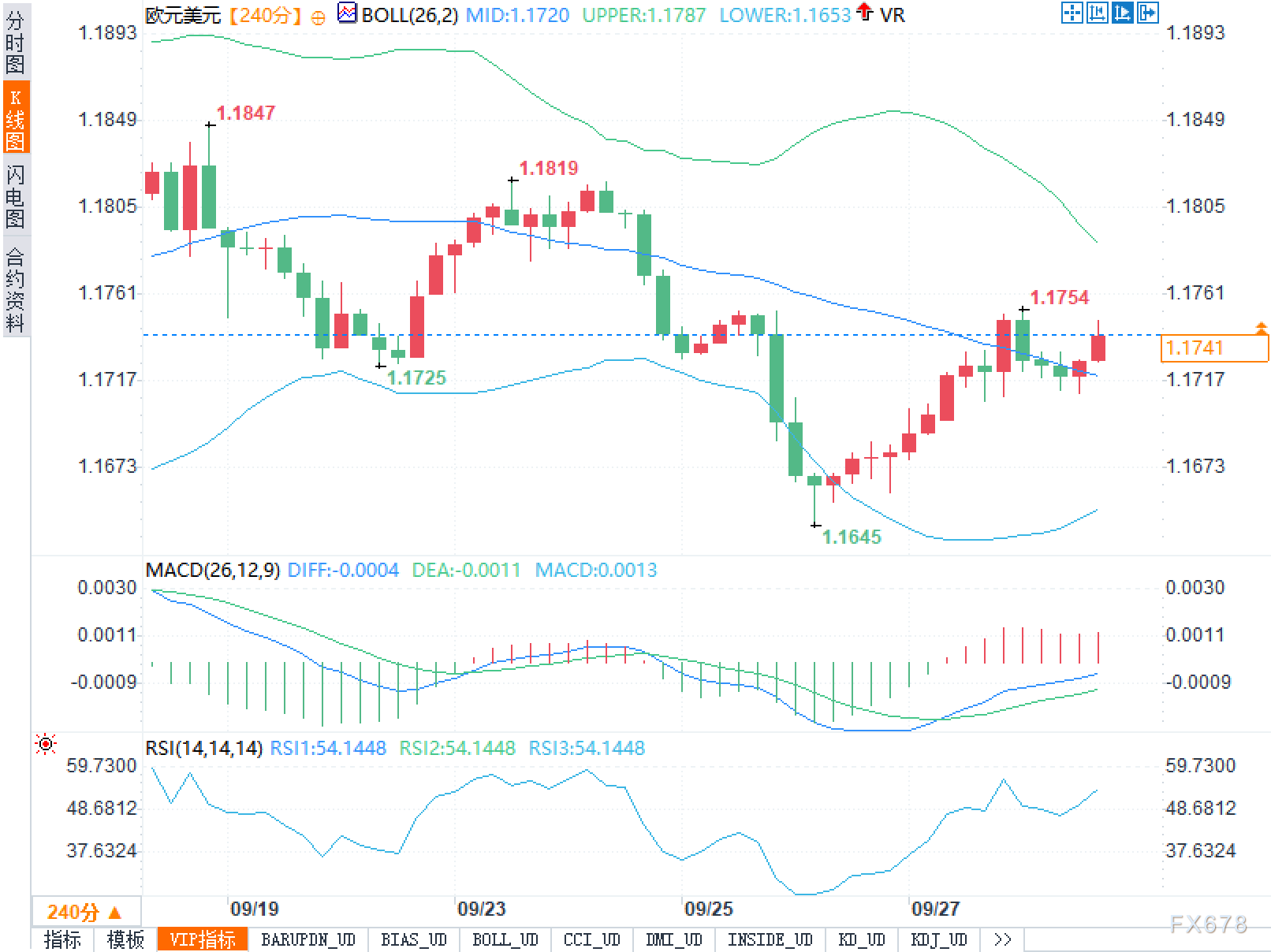 从240分钟K线观察,布林中轨在1.1720,上轨1.1787,下轨1.1653;当前价略高于中轨,显示短线处于中性偏强的均值回归上方区域。近端关键价位结构清晰:上方依次是1.1787(布林上轨)以及前高1.1819,再往上是更早的高位1.1847;下方依次是1.1725(前低/邻近密集成交区)与1.1720(布林中轨),再往下则是1.1653(布林下轨)与1.1645(近日低点)。