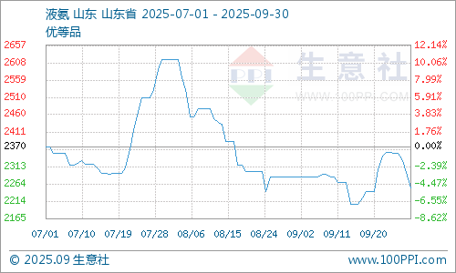 9月国内液氨延续了上个月跌势,跌幅明显放缓,逐渐企稳为主。据生意社商品行情分析系统,山东地区液氨3月跌幅在1.31%。截止月底,山东地区液氨主流价格在2150-2300元/吨。
