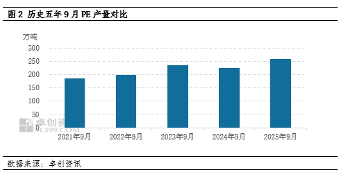 在产能快速扩张的背景下,月度产量同呈增加趋势。对比历史五年“金九”月度产量可看出,月度供应量呈增加趋势,五年间由月度供应量186增至259万吨,增幅在38.63%。细分来看,LLDPE供给量远超历史同期水平,其中2025年较2021年同期LLDPE月度产量增幅在48.29%,约增加38.35万吨,供给量的增加成为现货市场价格的拖累,同时也是造成本年“旺季不旺”的影响因素之一。区域供给量来看,因新增产能偏向于华东、华北、华南三大主力消费区域,故华北、华东、华南三大区域分别较2021年增30.96万吨、3.19万吨、12.61万吨。同时投产装置集中于全密度与LLDPE装置,约占新增产能的54%左右,从而熔指2线性产量供应量已远超同期,而引进的技术包多以巴赛尔集团所属为主,占新增产能的40%左右,故在生产出的管材、注塑、薄膜粒料等具有相似性,同类别产品竞争压力无疑是增大的。