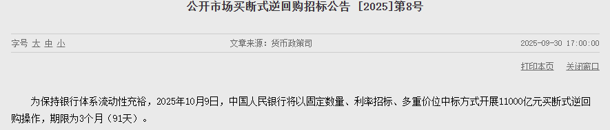 【大河财立方消息】9月30日,中国人民银行发布公告称,为保持银行体系流动性充裕,2025年10月9日,将以固定数量、利率招标、多重价位中标方式开展11000亿元买断式逆回购操作,期限为3个月(91天)。