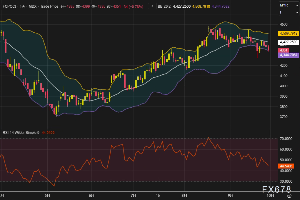 汇通财经APP讯——周二(9月30日)收盘,马来西亚衍生品交易所12月交割的基准棕榈油合约FCPOc3报收于4351林吉特/吨,当日下跌34林吉特,跌幅0.78%。尽管日线录得三连跌,但本季度该合约累计涨幅仍达到9.16%,成功扭转了此前两个季度的跌势。从技术图形观察,价格在布林带中轨附近获得支撑,而MACD指标虽位于零轴上方,但动能柱有所收缩,显示市场短期陷入多空平衡的整理格局。