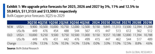 美银此前对2026年、2027年铜价的基准预期分别为10188美元/吨、12000美元/吨,但随着供应端问题持续发酵,团队将两年预期分别上调11%、12.5%,至11313美元/吨与13500美元/吨。这一调整背后是三大核心逻辑: