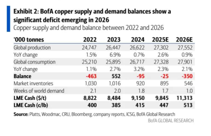 根据美银发布的全球铜供需平衡数据,2026年全球铜市缺口将显著扩大,供需紧张程度进一步升级: