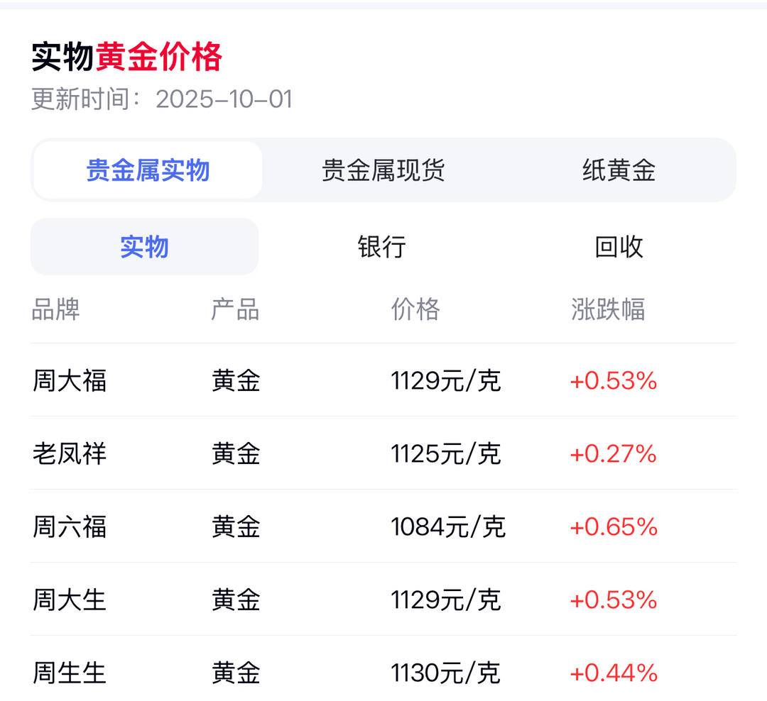 今日金价显示,周六福克金1084元,老凤祥1125元,周大福1129元,周生生1130元,周大生1129元,比9月30日上涨0.27%-0.65%。