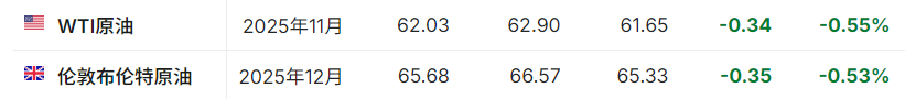 3.截至发稿,WTI原油跌0.55%,报62.03美元/桶。布伦特原油跌0.53%,报65.68美元/桶。