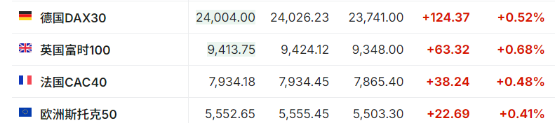 2.截至发稿,德国DAX指数涨0.52%,英国富时100指数涨0.68%,法国CAC40指数涨0.48%,欧洲斯托克50指数涨0.41%。