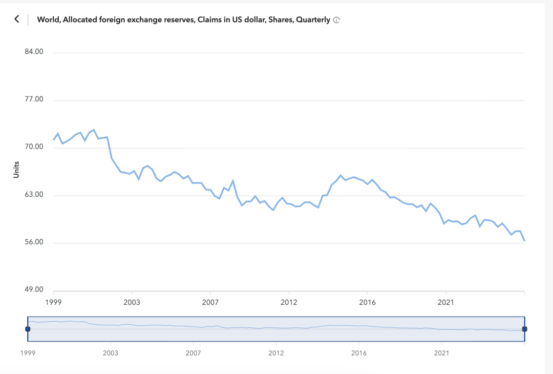 美元在全球央行外汇储备中的占比正在逐渐下降,当前已降至三十年来最低水平。