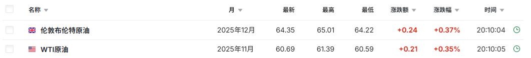 3.截至发稿,WTI原油涨0.35%,报60.69美元/桶。布伦特原油涨0.37%,报64.35美元/桶。