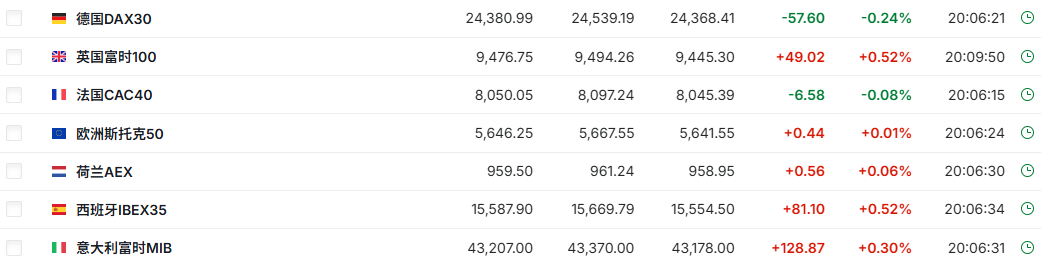 2.截至发稿,德国DAX指数跌0.24%,英国富时100指数涨0.52%,法国CAC40指数跌0.08%,欧洲斯托克50指数涨0.01%。