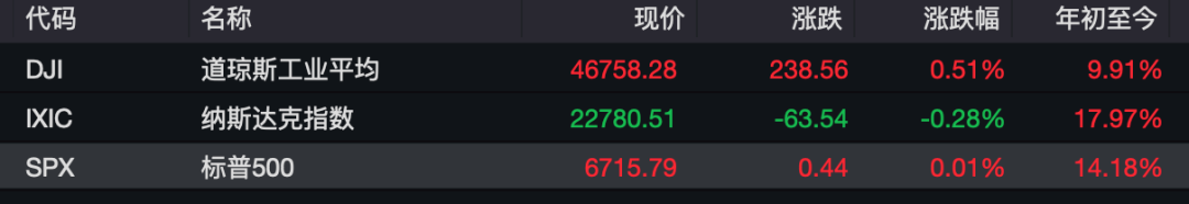 截至收盘,道琼斯工业平均指数涨0.51%报46758.28点,标普500指数涨0.01%报6715.79点,纳斯达克指数跌0.28%报22780.51点。其中,道琼斯工业平均指数、标普500指数均录得六连涨,并续创收盘历史新高。本周,道琼斯工业平均指数涨1.1%,标普500指数涨1.09%,纳斯达克指数涨1.32%。