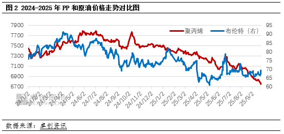 从价格方面来看,年内PP价格呈现持续下行态势,8月中下旬绝对价格突破7000元/吨关口,9月26日最新价格已跌至6750元/吨附近,该价格水平处于近五年以来的相对低位区间。从历史规律看,PP价格与油价长期保持高度正相关性,但进入下半年后,两者相关性显著减弱,8月以来油价对PP价格的支撑作用持续弱化,在市场供需格局偏松的背景下,成本端传导效率进一步降低。从相对估值角度考量,当前PP价格相较于油价已呈现明显低估特征。
