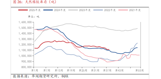 库存方面,周度数据显示,至9月21日,天胶社库111.2万吨,较上月底的127万吨下降12.44%。根据隆众资讯显示,深色胶社库66.7万吨,较上月底的79.7万吨,环比降16.3%。浅色胶社库44.6万吨,环比降5.71%。10月,在供应预期温和上升,需求端出口下降幅度预期有限,国内旺季预期下,库存或维持在目前水平。